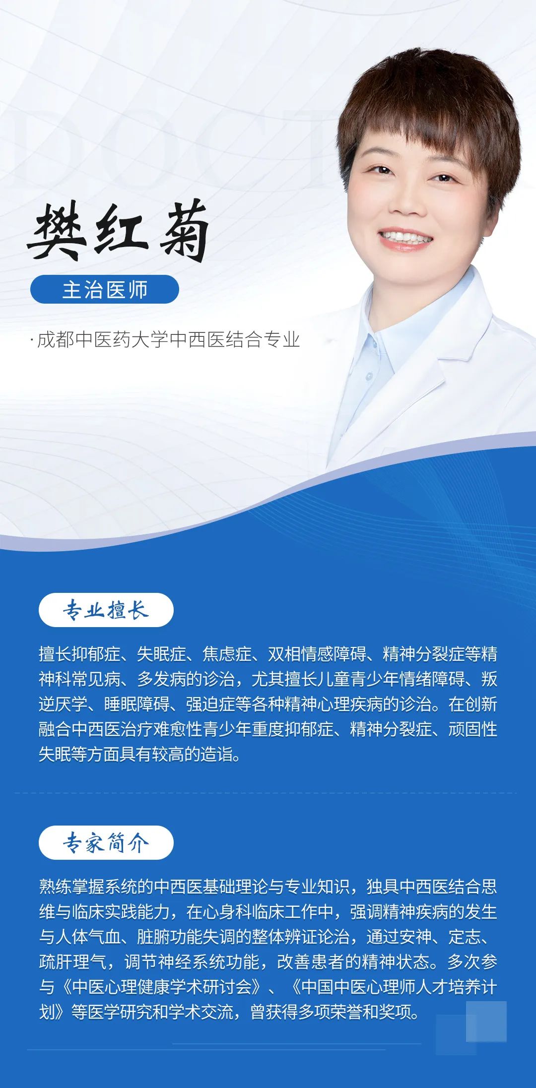 为满足众多慕名而来患者的就医需求,进一步发挥我院在精神疾病领域和精神心理康复指导方面的合力优势,特组建以本院学科骨干魏显仪、樊红菊、朱怡等多位优秀精神心理专家为核心的康复团队,医术共融,让患者在家门口享受到优质、科学、便捷的医疗服务。