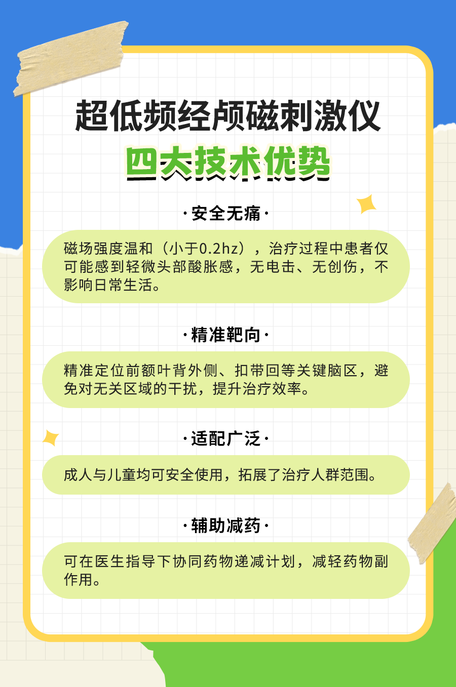 超低频经颅磁刺激仪是一种无痛无创的绿色治疗方法,通过调整大脑内部多种神经递质功能平衡,从而达到治疗目的,作为一种非药物辅助治疗,它对抑郁症、焦虑症、睡眠障碍等精神心理疾病,具有良好的临床疗效。